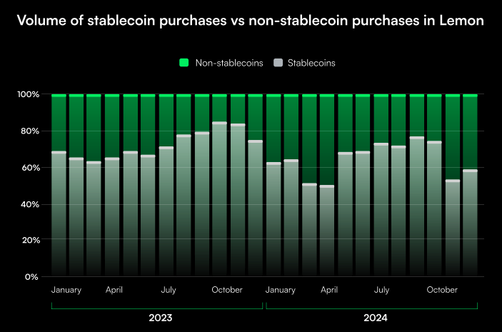 平台数据同样印证了用户参与度的增长趋势。拉丁美洲知名加密货币平台 Bitso 数据显示,截至 2024 年末其阿根廷用户基数较 2023 年增长 11%。当地最大平台 Lemon 截至 2024 年底拥有近 60 万比特币持有者,占其在阿根廷托管资产的 36%。稳定币占比 27%,阿根廷比索占持仓量的 18%。从交易量看,稳定币交易量增长 44.4%,比特币和山寨币交易量分别增长 126% 和 158.5%。