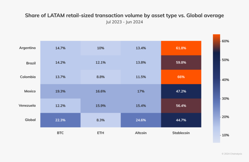 尽管加密货币应用广泛,但值得注意的是,稳定币在阿根廷加密货币领域占据压倒性主导地位。2023 至 2024 年间,阿根廷稳定币交易量占比达 61.8%,远超全球平均水平 44.7%。2022 年第三季度至 2024 年第二季度期间,阿根廷 31% 的小额零售交易(1000美元)使用稳定币完成,该数据在该地区仅次于委内瑞拉。