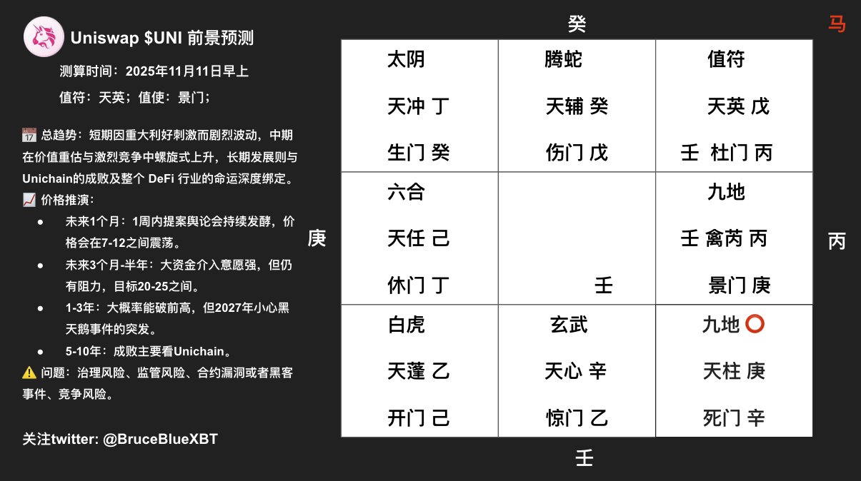 格局定位:坤宫「值符 + 戊丙青龙返首」,此乃王者归来、价值重估之象。费用开关的开启是引爆这一趋势的关键。 $UNI 将摆脱「无价值治理代币」的帽子,成为具有明确现金流和通缩预期的核心资产。