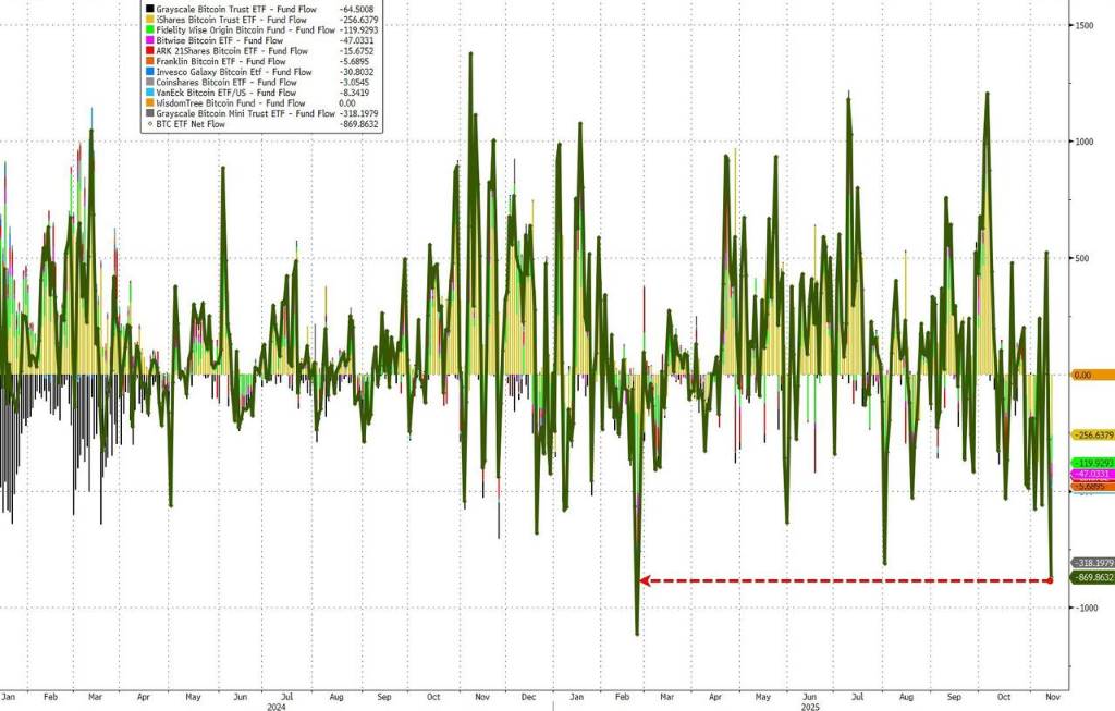与资金抄底科技股,以及黄金急跌后反弹相比,比特币是周五市场的一个明显例外:逆势下跌5%,创6个月新低,且已连续三周下跌。这一反差揭示了比特币市场的异常处境:在与纳斯达克100指数保持0.8高度相关性的同时,比特币却呈现出"跟跌更大,跟涨更弱"的不对称特征。与此同时,巨鲸抛售加剧,长期持有者集中出货等多重因素正在共同压制比特币。