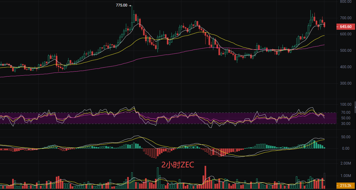 发稿前大零币现价646,丽盈判断当前大零币ZEC上涨趋势较强的多头信号。K线看涨吞没形态与MA多头排列形成共振,短期与长期均线的黄金交叉进一步确认了趋势的延续性。但是丽盈提醒大家成交量数据不足,无法完全确认当前价格走势的量价配合情况,这为短期走势增添了不确定性。