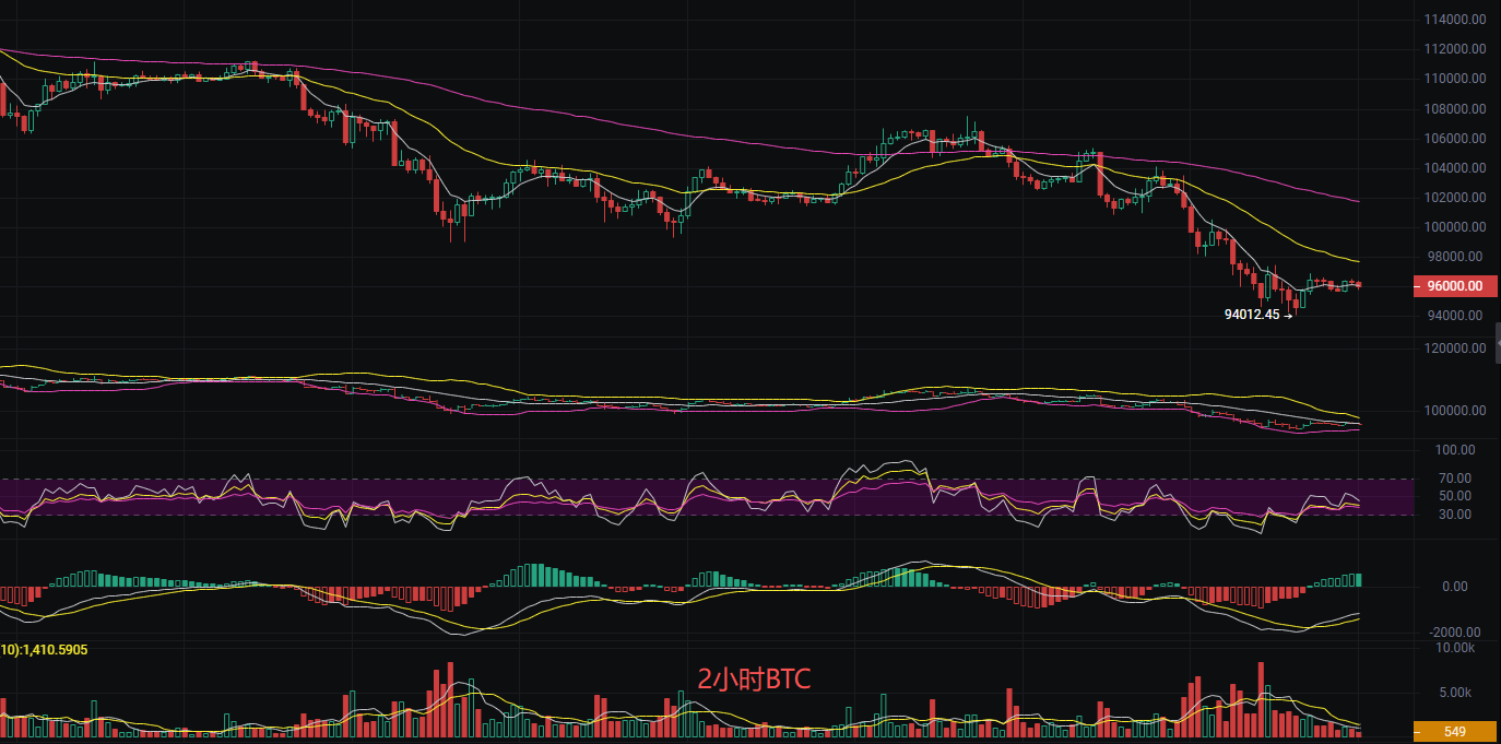 比特币现价96000,丽盈判断大饼BTC在关键支撑位94012和强阻力位98144波动,技术面尽管出现了看涨吞没形态,暗示市场可能有反转向上的潜力,但均线系统仍呈空头排列,价格位于均线下方,表明市场整体动能较弱,尚未完全摆脱下行压力。