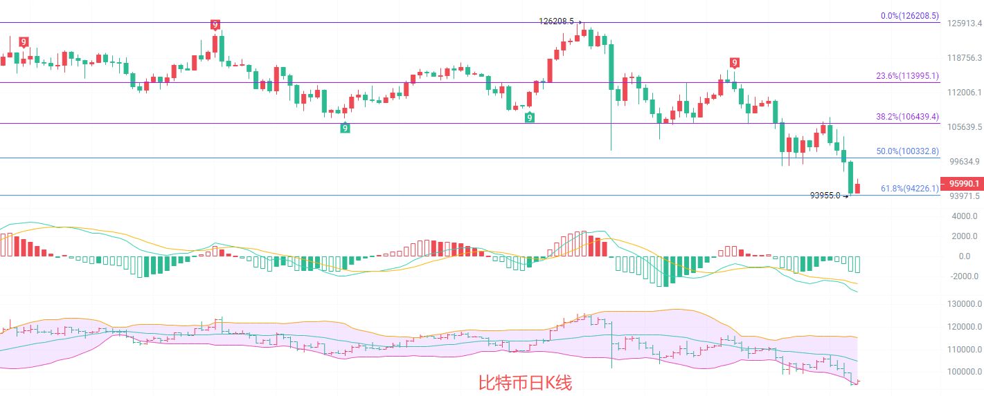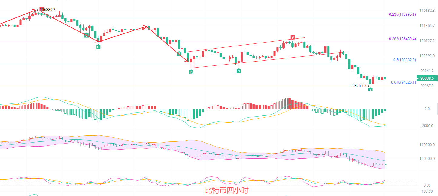 日K线发稿前最高96800,最低94500,昨日最低已经试探过618一线的支撑强弱,连续两天日K线站立0.618一线说明短线支撑94000支撑有效,建议北上的币友做短线,在96000上方找位置离场,快进快出,EMA趋势指标向下交替扩散趋势可以看见空头指标在拉开距离,说明有至少还有一次的深度探底或者暴力回调,MACD缩量增筹K线背离上行,DIF和DEA依旧是空势,布林带下轨支撑关注94700,目前的行情波动深度不够建议观望,等机会