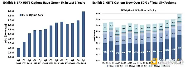 全球股票市场规模约为100万亿美元,几乎是整个加密市场的25倍,仅美国股票市场规模就达60万亿美元。与加密市场一样,股票市场参与者对杠杆也有强烈需求。零到期日(0DTE)期权的爆发式增长就印证了这一点——这类期权主要由散户投资者交易,占标普500指数(SPX)期权交易量的50%以上。散户投资者显然希望以杠杆形式获取标的资产的价格波动敞口,而代币化股票的永续合约可以直接满足这一需求。