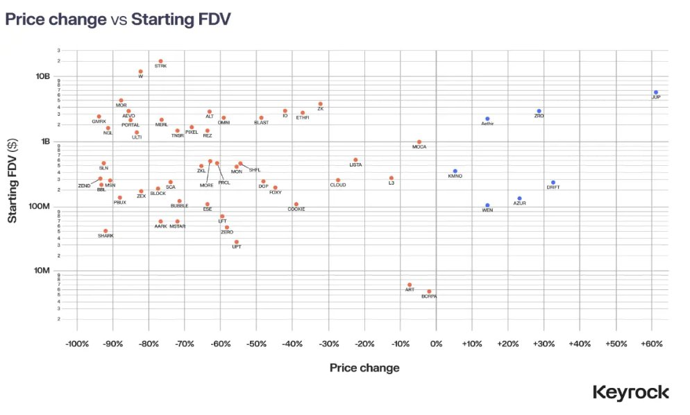 过高的 FDV 会毁掉代币的价格;要明白,空投并不会违背基本估值逻辑而产生「魔法」。在 2024 年,许多空投项目以极高的 FDV 上线,但在两周内价格迅速暴跌 50%-80%。