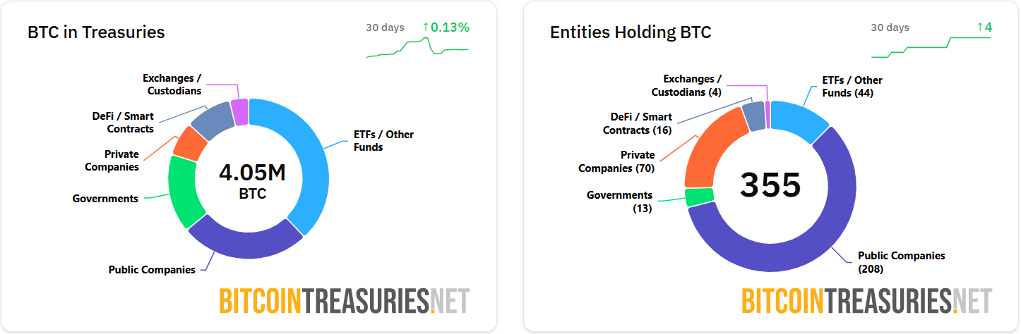 Data from bitcointreasuries.net indicates that in the past month, 4 new entities have added Bitcoin to their reserves, bringing the total number of entities holding BTC globally to 355. Institutional holdings have increased by 4.05 million BTC, valued at approximately $400 million in the past month. Looking at a longer time frame, in the third quarter, publicly listed companies net purchased 195,000 BTC, with an investment scale reaching $20.5 billion.