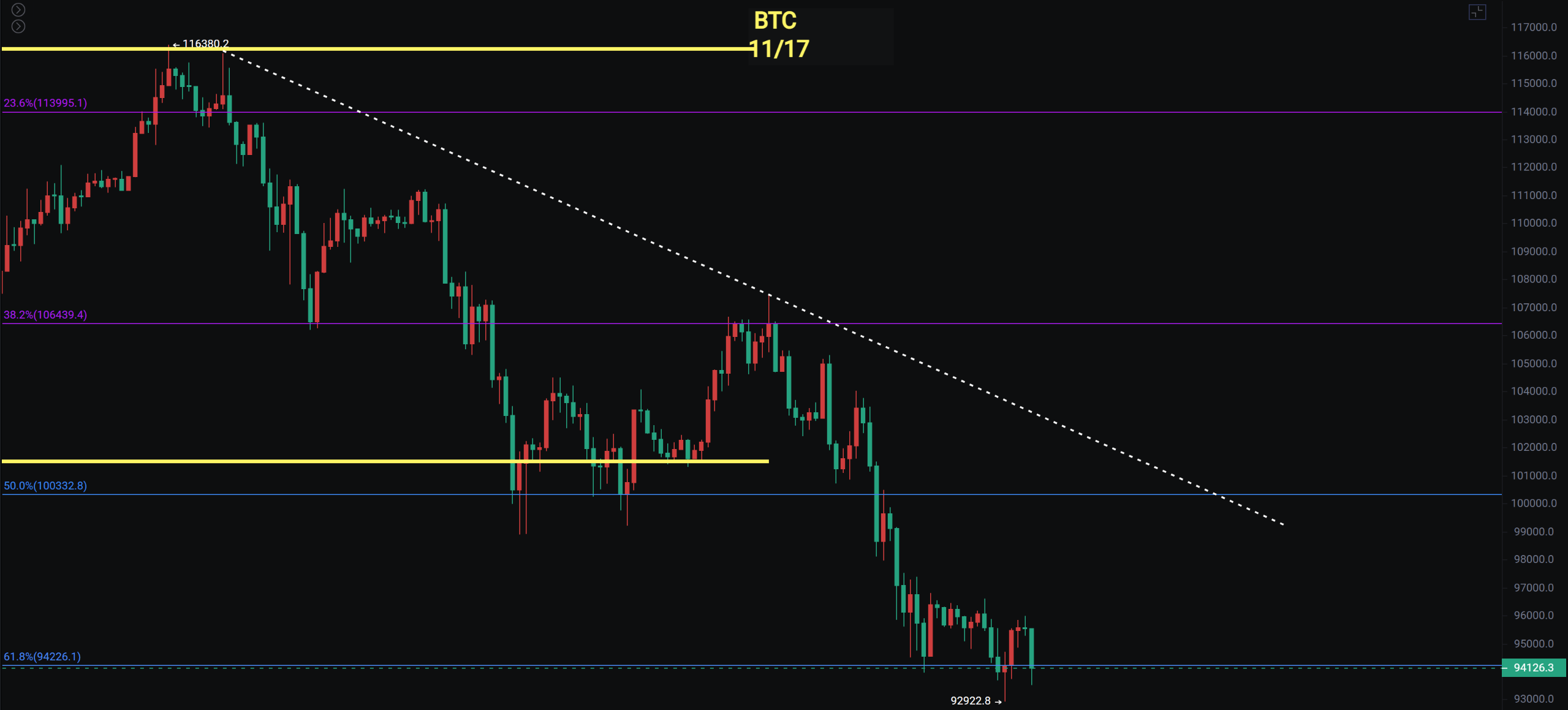 比特币的周线大阴线,而且跌破了插针的底部,到目前来看都没有出现明确的见底信号,最低至92922 ,91600至92000附近是年初跌破至74500的平台支撑位,这个支撑是比较关键的,从最高点下来已经跌了26.3%已经跌到了斐波那契线0.618附近。