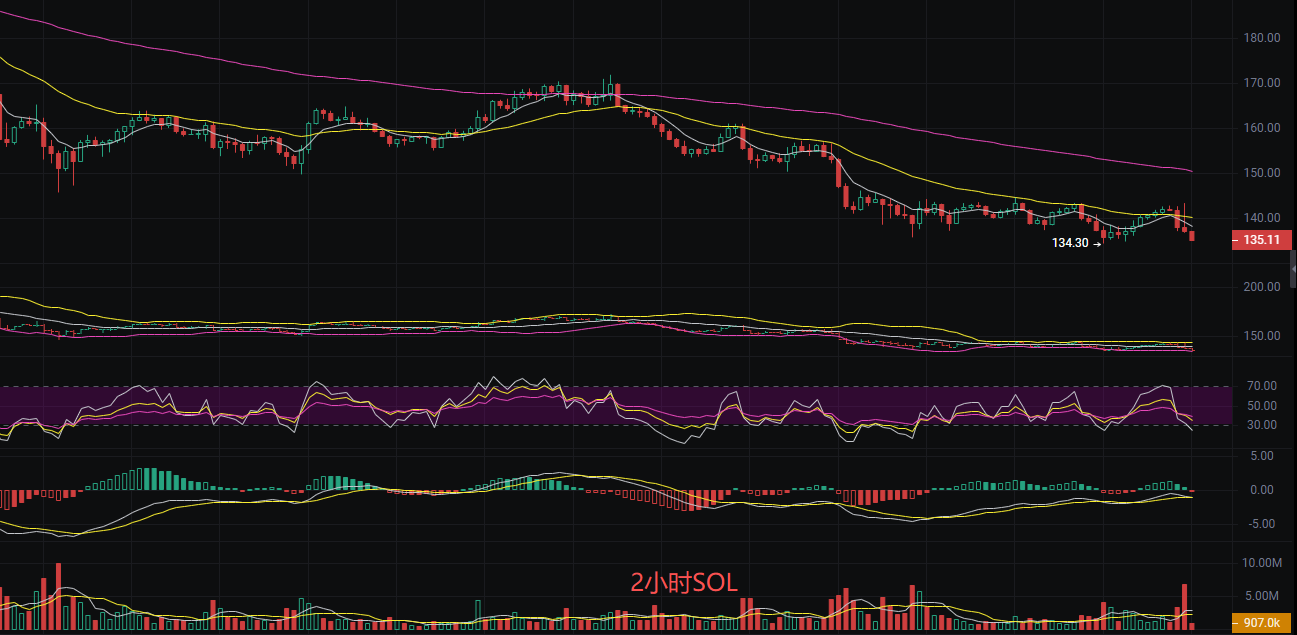 索拉拉目前价格为138,丽盈判断目前索拉纳SOL明显的下跌趋势,技术面信号显示空头力量占据主导地位。短期和长期均线均向下排列,价格持续位于均线之下,形成典型的空头排列结构。此外丽盈还看见盘口的成交量在价格下跌过程中放大,量价齐跌的共振进一步确认了卖方力量的增强。日线持续下跌,形成多个阴线,整体呈现弱势格局。