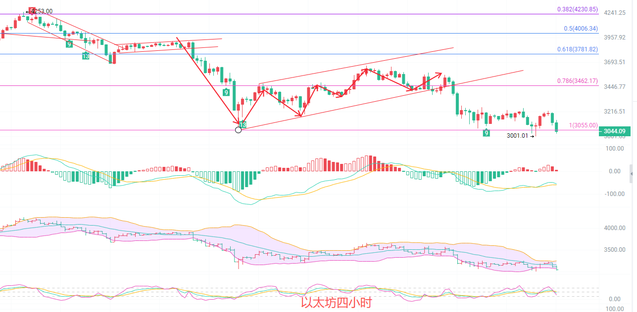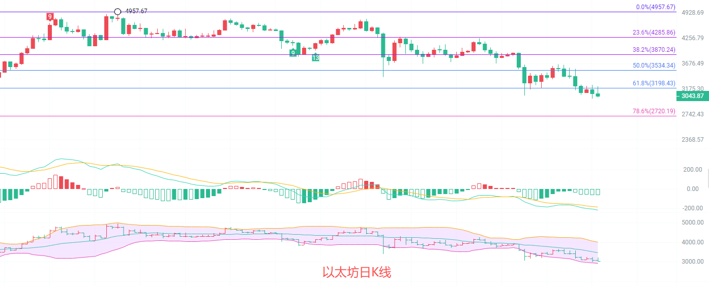 日K线发稿前最高3223,最低3024,EMA15趋势快线已经来到了3350,EMA趋势指标整体向下扩散,快慢线拉开了距离,MACD缩量增筹不明显,说明下方支撑很强,DIF和DEA向下扩散走南,布林带向下形成下降通道,下轨关注2919,中轨关注3470,行情来到3000关口进入了极端超卖区域,可以北上试仓,做好防守带好止损,错了别抗单,该止损止损