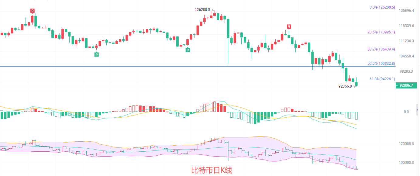 日K线最高点96000,最低92360,EMA向下拉开身位以后,EMA15快线已经抵达了分割线0.5一线10关口,MACD缩量增筹,DIF和DEA显示大空趋势,布林带向下开口,下轨来到了92100,日K线一直围绕布林带下轨向下走,加上RSI指标已经进入了极端超卖的行情,随时有反转的行情出现,技术面有回调的需求,所以在目前这个位置可以北上试仓