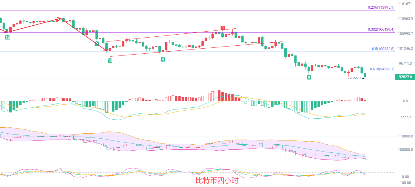 四小时K线再一次跌破了关键支撑94000和93000两个关口,EMA趋势指标下探若92000再一次失守,MACD就会形成缩量死叉趋势,DIF和DEA交替扩散向下形成的空头指标,布林带收缩以后下轨还在93200,K线背离了布林带,中轨关注95300,思路上跌破布林带以后行情进入了极端超卖区间,可以在底部关键位置寻求北上试仓点,注意做好风控,错了就小损出,对了空间还不错
