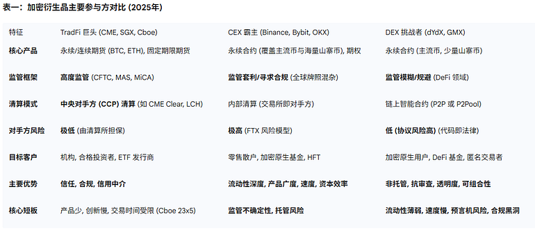 特征: 高合规性、CCP 清算、高「合规溢价」 、创新缓慢。这是「风险管理」的市场。