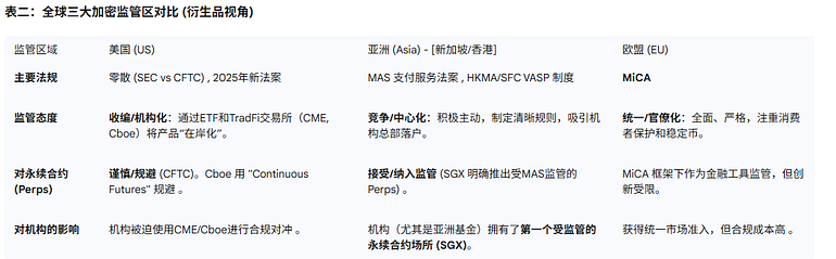 亚洲 (MAS/HKMA): 新加坡和香港的策略是「筑巢引凤」。它们正在打造全球最清晰、最亲机构的定制化加密监管框架 。它们的目标是成为美国之外的全球机构加密中心。SGX 推出永续合约 ,是新加坡国家战略的金融武器。