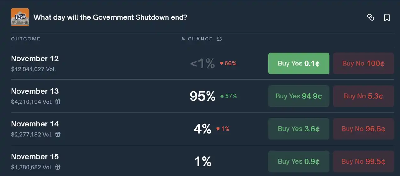 This ultimate certainty event, like other political events, triggered a strong market reaction immediately: the price of the Yes shares for "the shutdown ends on November 12" on Polymarket skyrocketed, peaking at $0.97. In the logic of prediction markets, this means the market consensus believed there was a 97% chance of this happening. Since the maximum price can only reach $1, or a 100% probability, buying at $0.97 only yields a final 3% profit, but this 3% is a guaranteed win with no risk, as the event has already been confirmed.