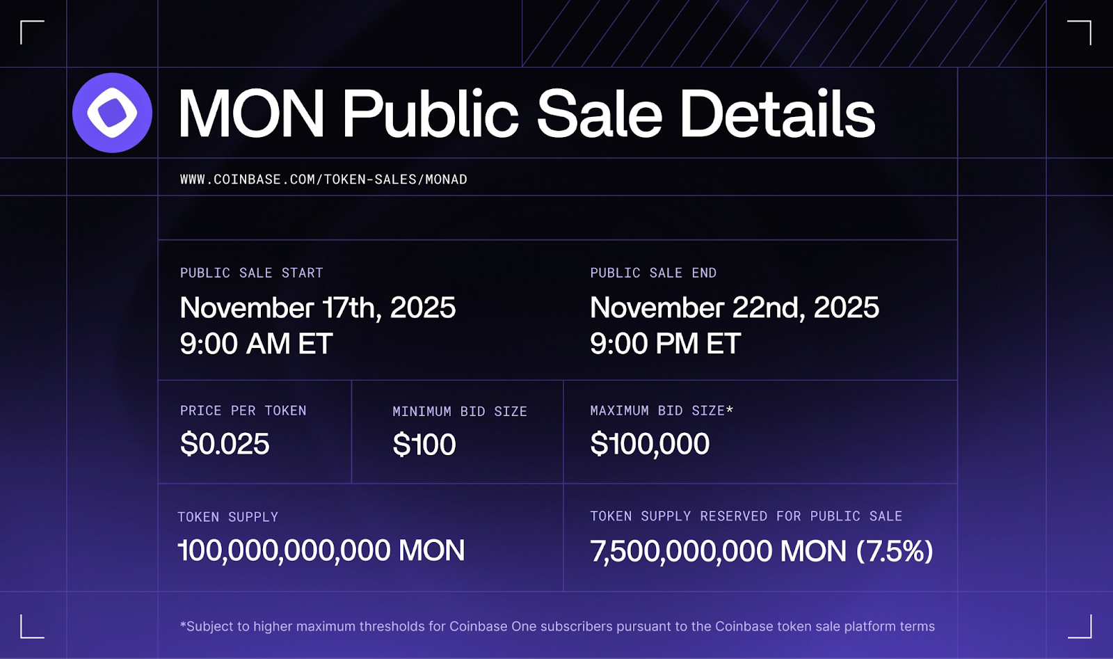11 月 17 日,新一代高性能 Layer 1 公链 Monad 作为 Coinbase 全新代币公募平台的首发项目,正式启动 MON 公开发售。本次公募将持续至 11 月 22 日,代币预计于11月24日在Monad主网上线当日同步发放。作为 Coinbase 推出新公募平台后的首个代币发行案例,Monad也被视为 Coinbase 探索公开、透明、合规代币发行路径的重要试验。