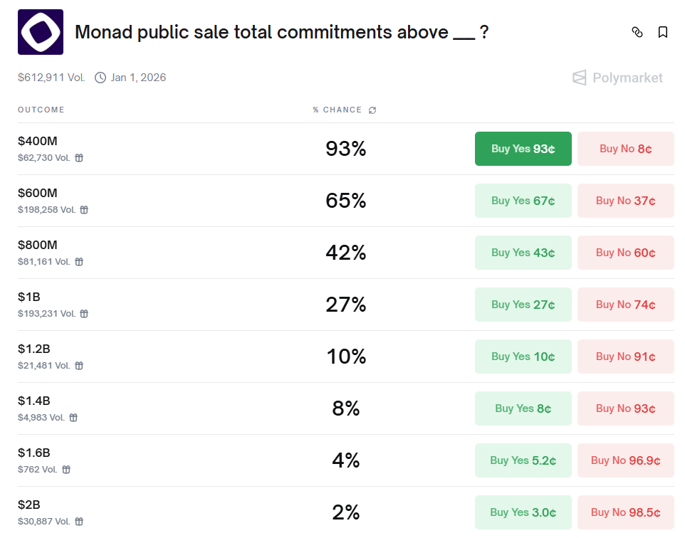 预测市场Polymarket的数据,则更直观地反应了目前的市场情绪。现阶段,多数资金押注公募规模将超过4亿美元,其概率为93%;认为最终金额能够突破 6 亿美元的概率为65%。随着目标认购金额区间的提升,市场信心迅速下降,认为突破 10 亿美元的概率约为 27%,而超过 20 亿美元的概率仅剩 2%。整体来看,市场普遍认为 Monad 公募最终大概率落在 4 亿至 10 亿美元的区间。