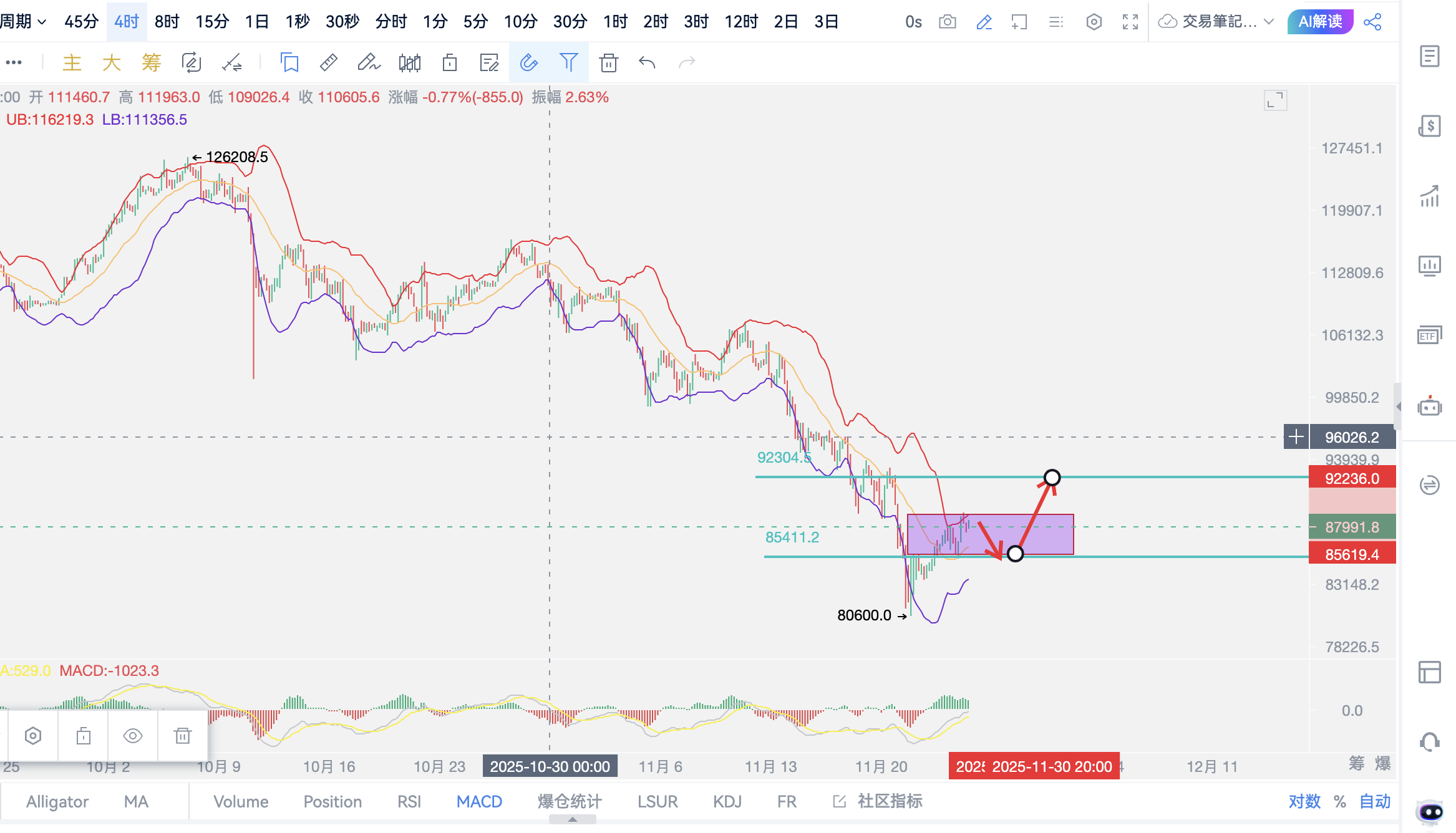 Family, who understands this! Yesterday BTC played a deep V reversal, and I accurately captured a profit of 2000 points on my long position, perfectly wrapping up! 🎢 On the four-hour chart, the price pierced the upper track but didn't stop, then fell back down; now it's in a wide-ranging oscillation! The Bollinger Bands are still moving upwards, with 86000 as the iron bottom and 89000 as the high-pressure zone. Keep an eye on these two positions! 🚀