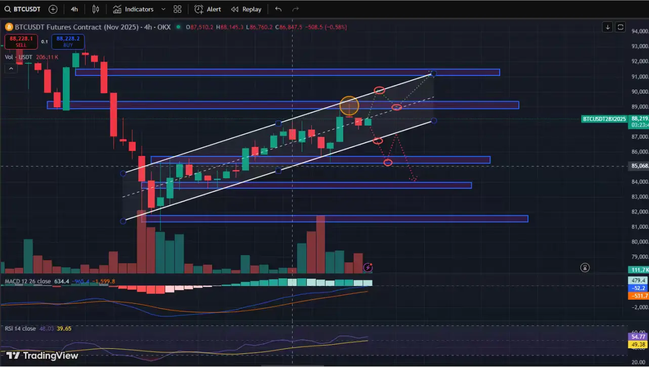 Support below is at the channel's lower boundary near 86,500; the lower consolidation range of 84,500-83,500 must not be effectively broken (holding this level may lead to horizontal consolidation; otherwise, there is room for downward movement). Indicators show that both MACD and RSI are recovering upwards, supporting a rebound.