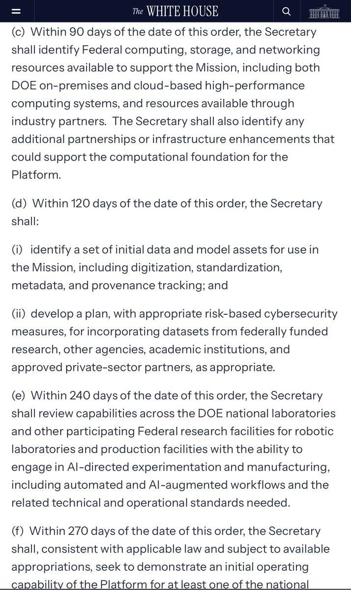 该命令明确要求能源部(DOE)和白宫科学办公室: