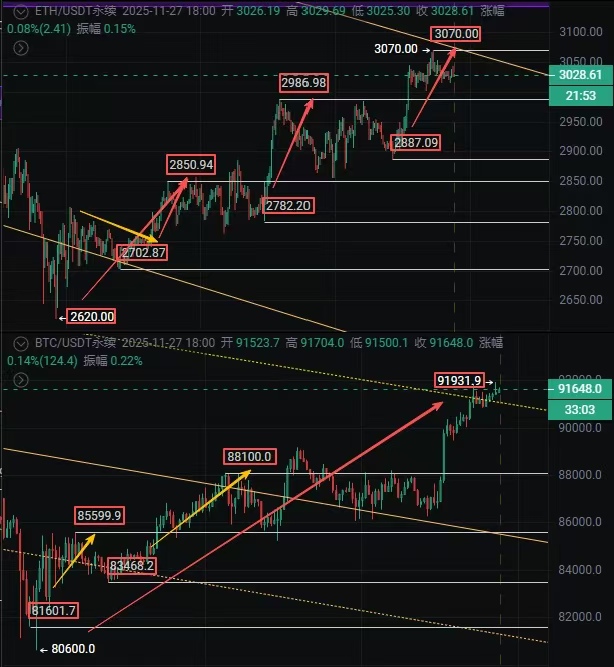 The retreat of Ethereum is due to hitting resistance in the price range, while Bitcoin's continuation is due to the reverse buying of liquidated contracts. Therefore, as long as Bitcoin does not clearly break down, Ethereum will continue to be stuck in a grinding phase until Bitcoin establishes a direction. So, it is not advisable to bet on short-term targets now; entering without basis is simply gambling. However, we can think in the opposite direction: assuming a false breakout to the upside, prioritize making a trade near Ethereum 3,010 and Bitcoin 91,000, targeting Ethereum 3,100-3,130 and Bitcoin 93,000-93,500, and then start testing the shorts.