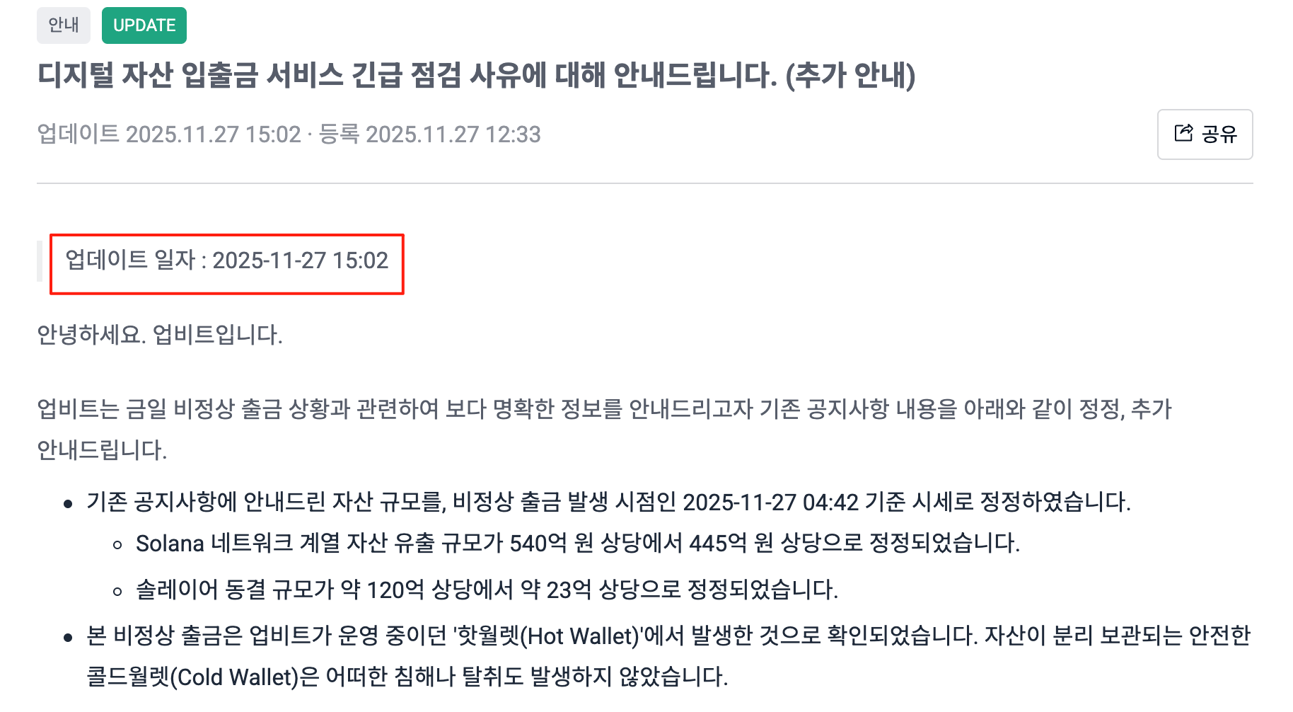 下午 2 时左右,Upbit 官方更新公告信息如下: