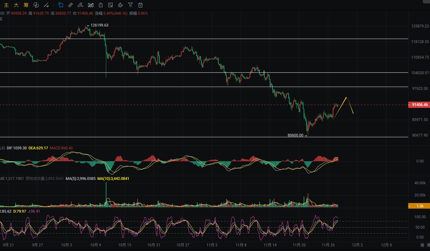 昨天感恩节,鉴于美盘休市影响,后面半天果然走势没什么波动。本周周一到周三基本行情都是在区间来回震荡,要说震荡破位的话,这波拉涨确实算得上破位了。目前币价的买点已经非常透明了,88000作为周初突破回踩价格毋庸置疑,89000也是一个可靠的买涨价格,只看它延续拉升的话,那么90500是个很关键的位置,一共就这三个,如果一波能够把这三个价格贯穿跌破,短期的这波看涨情绪肯定就会溃败,但目前来看这个概率极低,受到交投量清淡的限制暂时也不会有如此极端的表现。