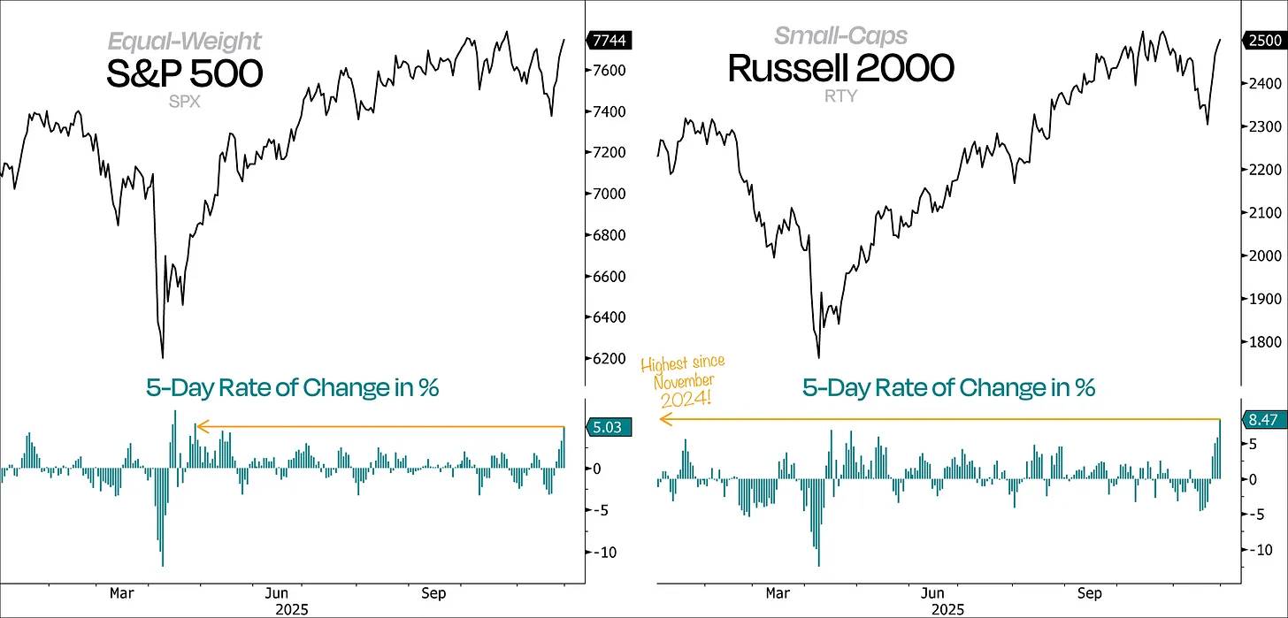 Moreover, this rebound has shown to be very broad and with huge trading volume; it is no longer just an oversold bounce but a genuine buying push. The best way to prove this is to look at the 5-day change rates of the equal-weighted S&P 500 index and the Russell 2000 index.