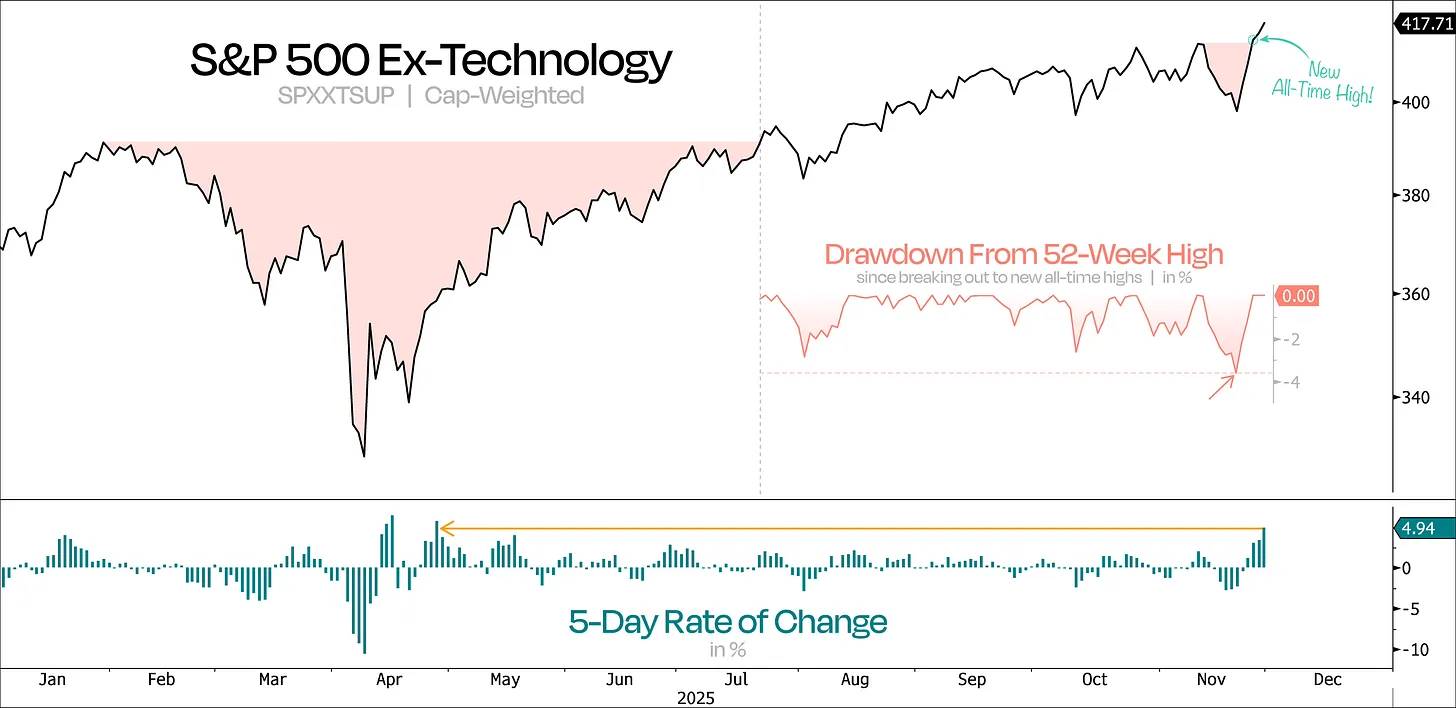 From our next chart, we can see that excluding the technology sector, the overall market seemed to weaken at one point. However, thanks to recent positive changes, the S&P 500 ex-tech index set a new all-time high just three days after experiencing its deepest pullback since breaking out in July.