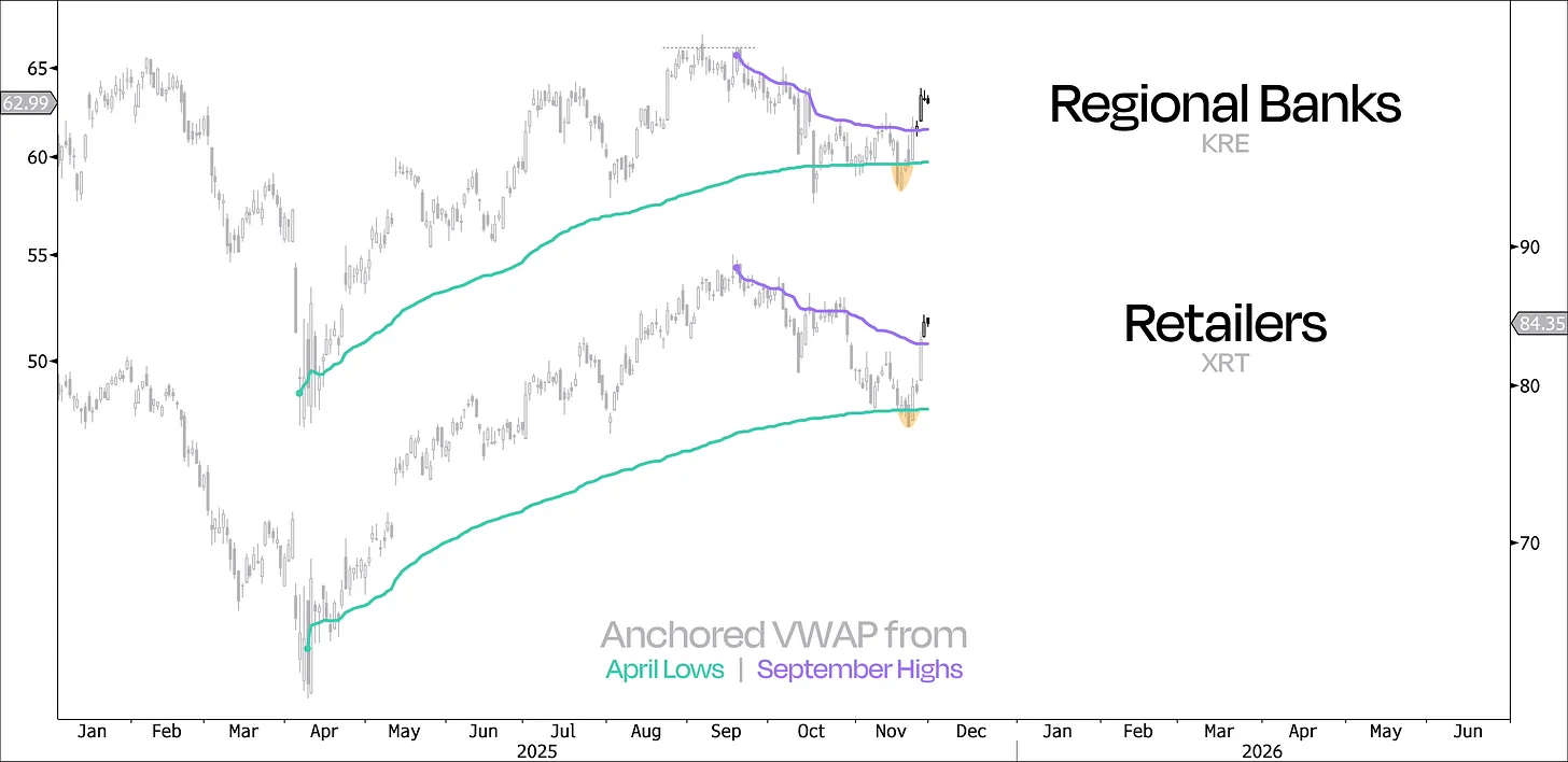 Take regional banks and the retail sector as examples; they once fell below the anchored VWAP (Volume Weighted Average Price) since the April low, but then captured strong momentum, rebounding above the anchored VWAP of the September high.
