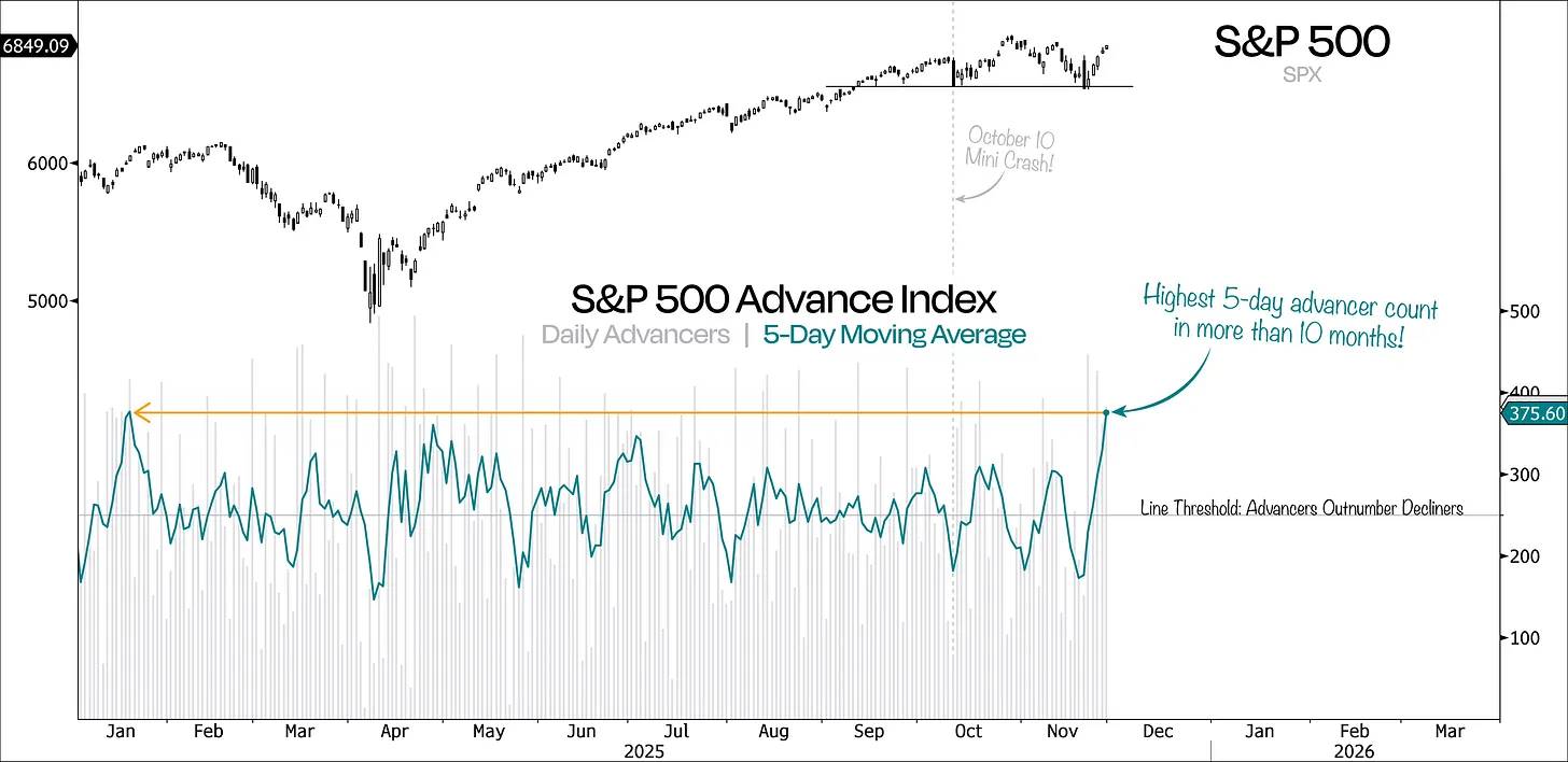 Overall, all of this points to a stronger and more sustainable rebound, far surpassing the initial attempt to rise after the October low. At that time, the S&P 500's upward momentum quickly fizzled due to insufficient market participation. This time, we see the number of stocks rising within a 5-day range has reached a new high in over a year, just a few days ago, this rolling average was at its lowest level in nearly four months.