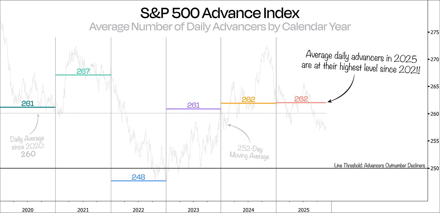 From this perspective, the performance in 2025 has been quite strong—the average number of advancing stocks per day has reached its highest level since 2021. In other words, during this year's bull market, market participation has been stronger than in previous years.