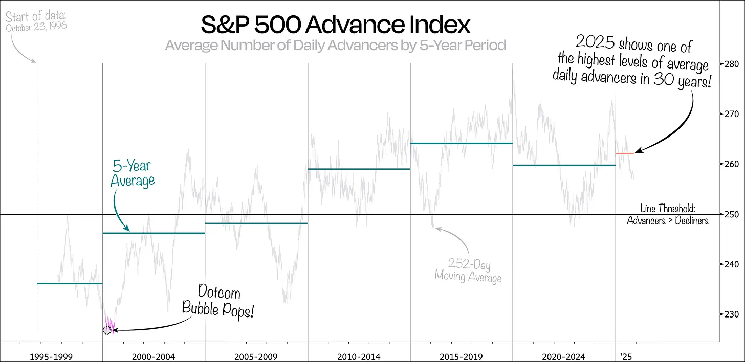 Additionally, aside from 2025, which has shown near 30-year highs in the average number of advancing stocks per day, we can also see how narrow market participation was just before the peak of the internet bubble. In fact, one of the worst 1-year periods was right around the March 2000 bubble burst, when market participation was extremely low.