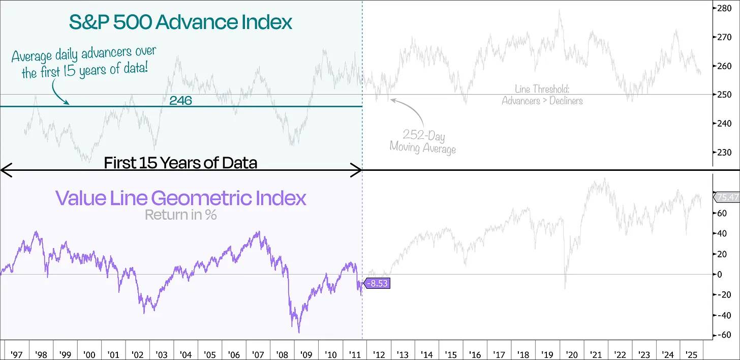 A better way to track long-term market participation is to observe the average number of advancing stocks per day throughout the year or use a rolling 252-day average.