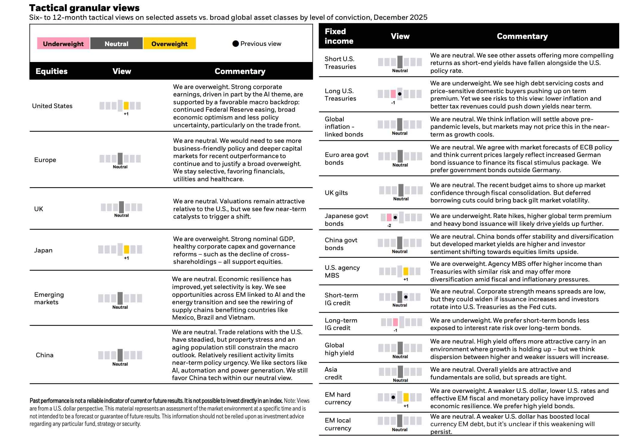 - 美国股市(超配):强劲的企业盈利(部分由 AI 主题驱动)叠加良好的宏观背景都将支持美股表现;