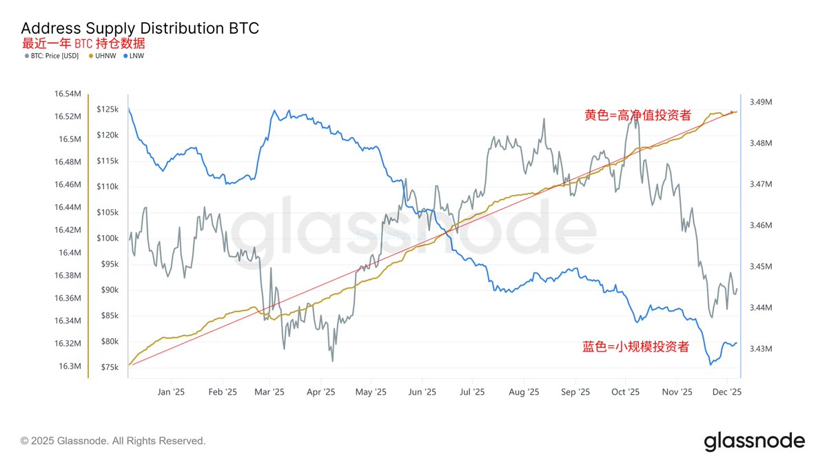 反而是小规模投资者受到价格的影响比较严重,而且从一年的趋势来看,持仓小于10枚 BTC 的小规模投资者一直在卖出。截止到目前高净值投资者一共持有 1,652.4 万枚 BTC ,而小规模投资者则持有 343.1 万枚 BTC 。
