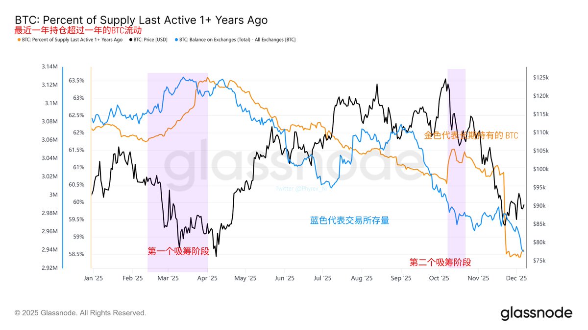 另外从持仓超过一年的 BTC 数据来看,最近一年也是在持续降低的,可能很多小伙伴认为这是长期持有者的抛售行为,但我分析了交易所存量的对方,发现有很强的相似度,虽然不能说长期持有者的减持都是来自于交易所,但确实交易所存量的下降,是长期持有者减持的一个原因。