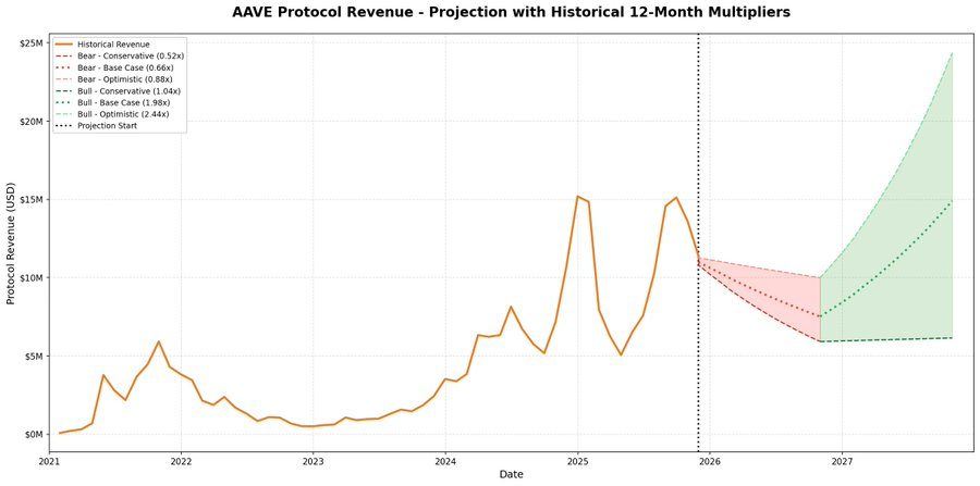 这一模型结果显示:Aave 相较于第一次熊市周期已明显成熟。未来收入仍可能回落,但回撤幅度将显著温和。