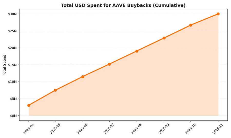 累计数据表明,在回购计划启动后的前 8 个月内,Aave 已累计投入约 3000 万美元。若要实现 年度 5000 万美元的官方目标,对应的月均节奏应达到约 417 万美元。而目前实际执行的月均节奏约为 375 万美元。按照当前速度测算,年化回购规模约为 4500 万美元,对应与目标存在约 10% 的偏差