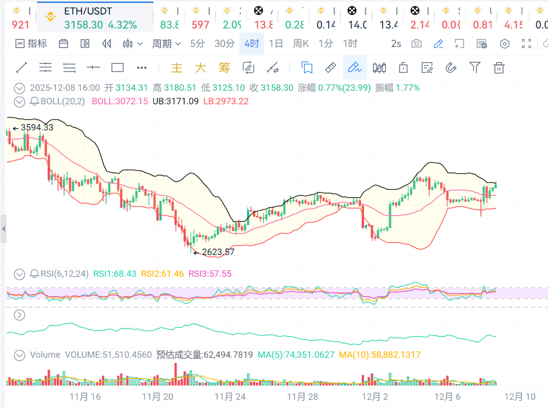 ETH:4小时级别看,价格继续保持在布林线上轨附近,短线价格超买,价格有回调需求,可以适当减仓止盈,支撑位3140,压力位3170.
