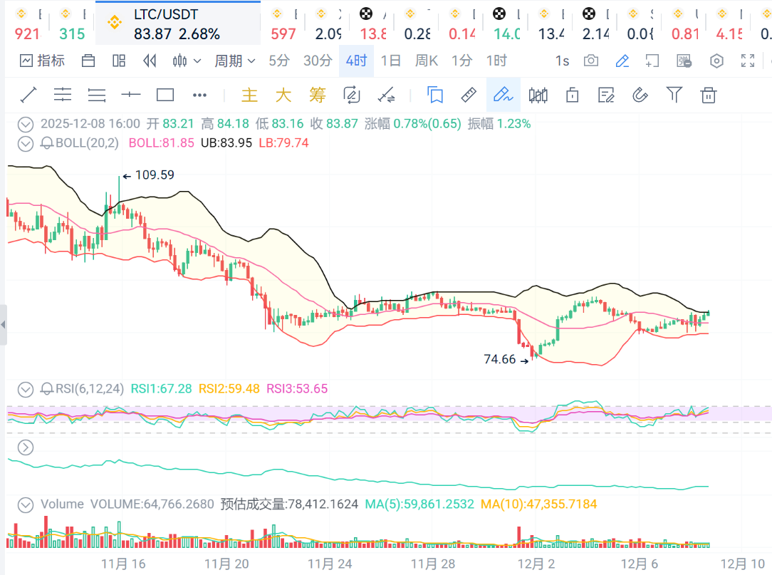 LTC:价格继续保持在布林线上轨附近,价格走势依旧健康,支撑位82,压力位85.