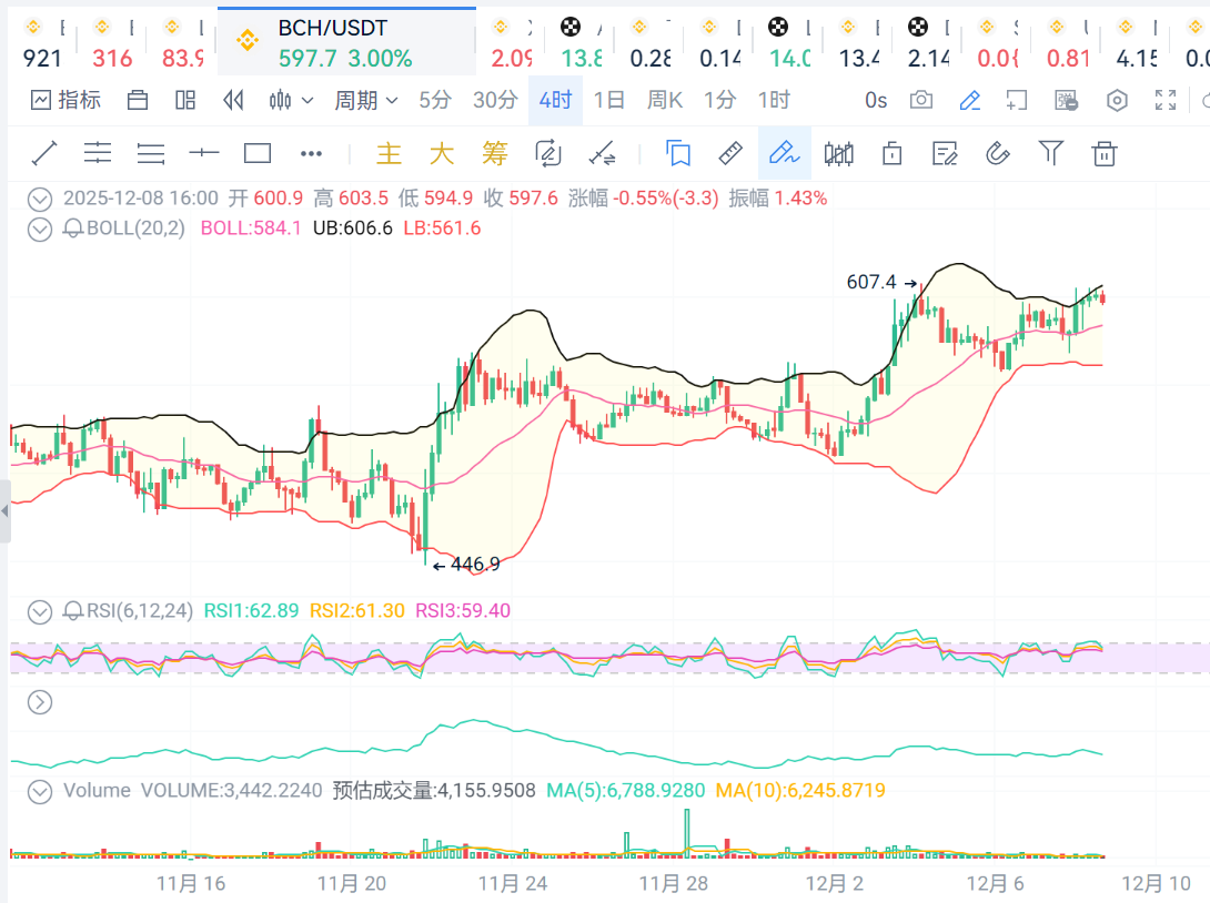 BCH:价格反弹受制于布林线上轨,价格走势依旧健康,支撑位590,压力位610.