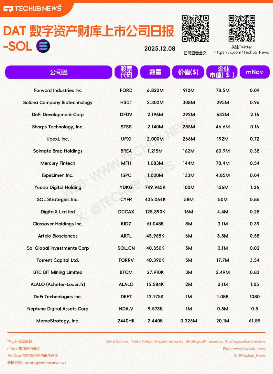 Forward Industries以910万美元SOL持仓领跑,Solana Company Biotechnology和DeFi Development Corp紧随其后。DeFi Technologies持仓仅12.775K SOL,但mNav(市值与价值比)高达1080,估值潜力突出。头部企业持仓价值超百亿级,中小公司布局更趋差异化。