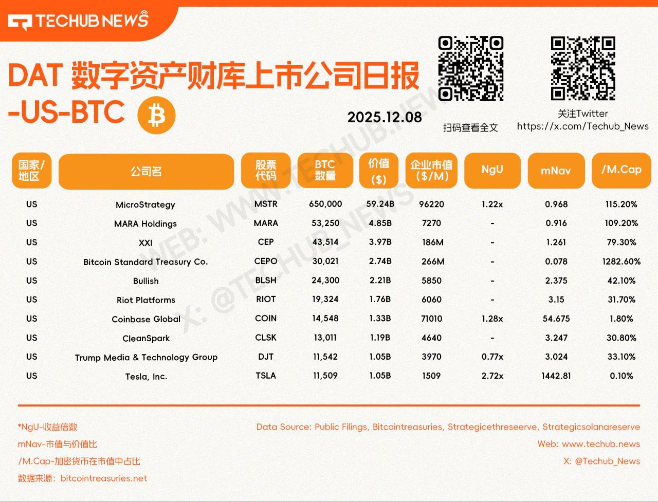 MicroStrategy以65万枚BTC(592.4亿美元)霸榜,/M.Cap 115.20%。MARA、XXI跟进,Bitcoin Standard Treasury /M.Cap超1282%。Tesla持仓1.15万枚,NgU(收益倍数)2.72x,mNav分化凸显机构策略。