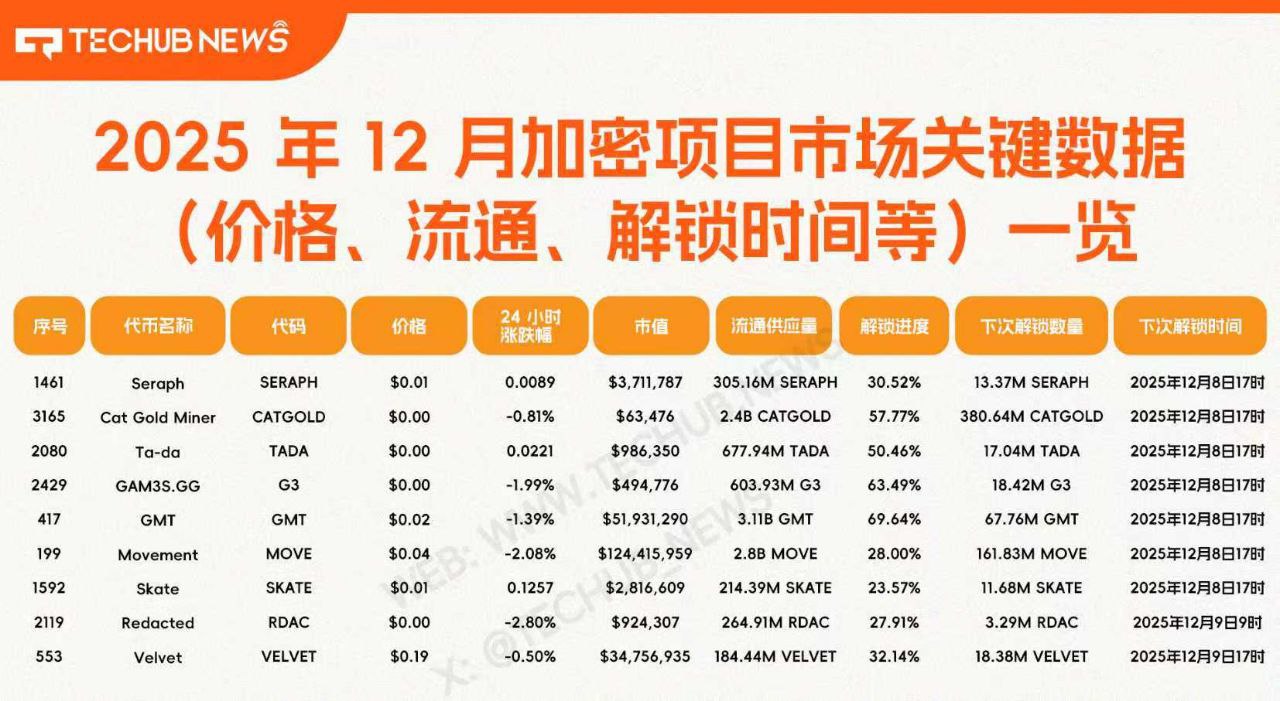 12月加密项目关键数据出炉,今日(17:00)多项目解锁高峰: