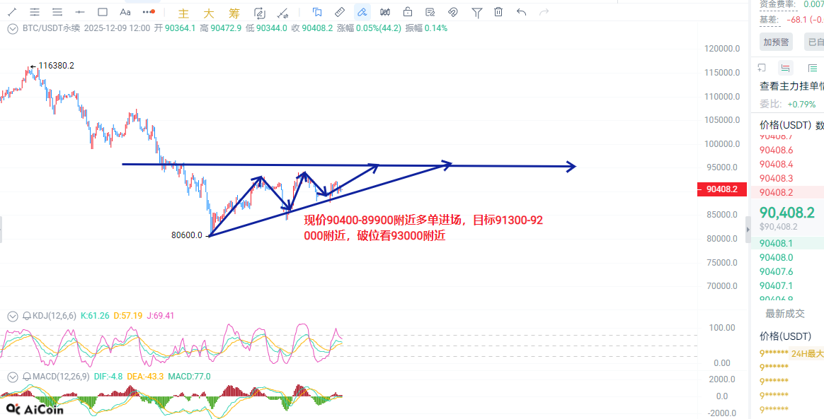 建议比特币现价90400-89900附近多单进场,目标91300-92000附近,破位看93000附近