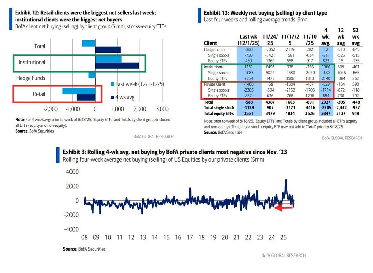 过去连续 12 周都在逢低买入的散户,在进入黑五前后突然转向,在最近 1 周到 4 周内连续净卖出,而且卖出非常果决,几乎可以确认是节日季现金需求叠加对短期宏观的不确定感所触发的撤退行为。