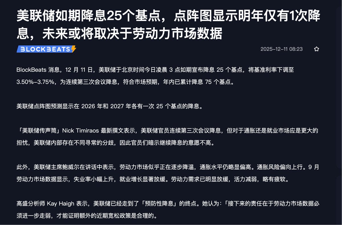FOMC 虽然降息但也只是符合预期,点阵图给的是利空:“别想太多,明年可能只降一次。”