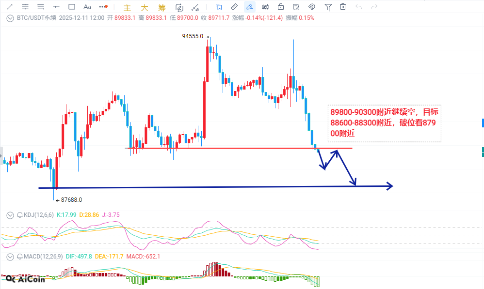 建议:比特币现价89800-90300附近空单进场,目标88600-88300附近,破位看87900附近