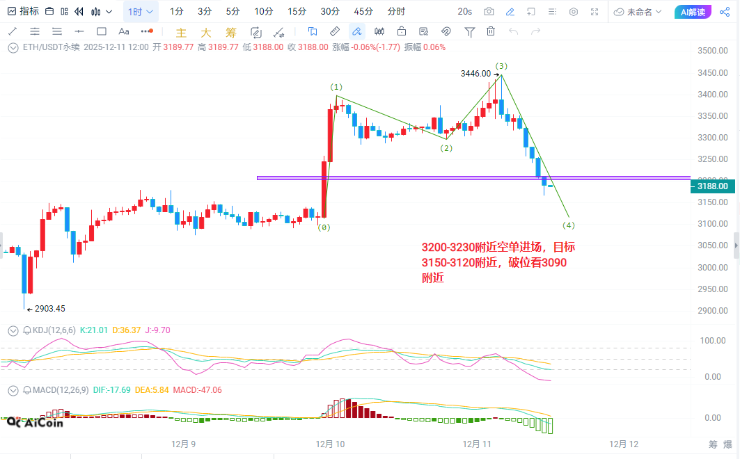 建议:以太3200-3230附近空单进场,目标3150-3120附近,破位看3090附近
