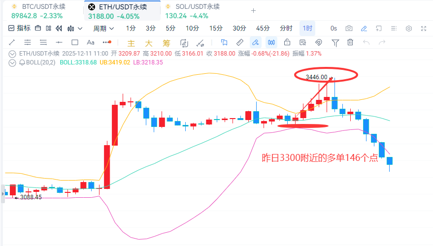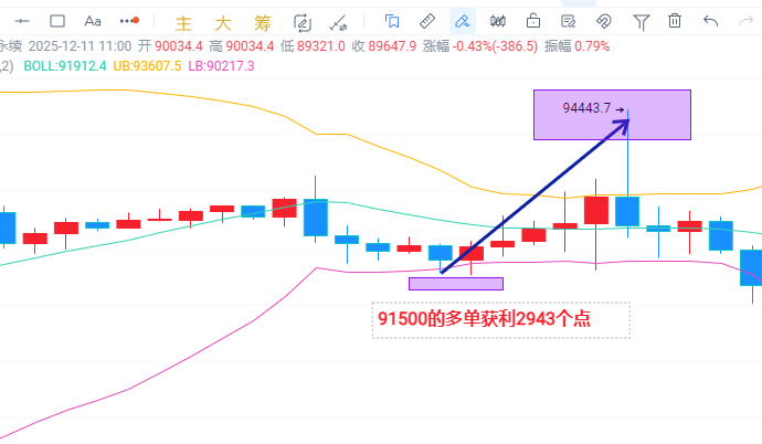 另外昨日以太3300附近的多单,已经盈利了146个点,比特币91500的多单获利2943个点,恭喜关注并跟上的客户。
